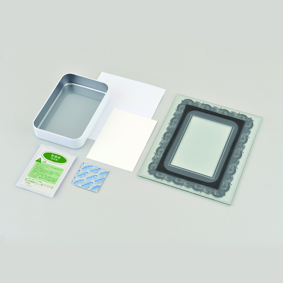 ガラスフレーム・D-CAN・黒クッション枠・底板台紙・はがき台紙・乾燥剤・脱酸素剤×各1