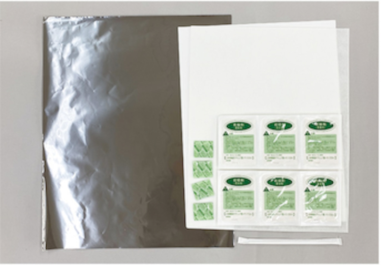 白紙、白クッション紙、アルミシート、ストロー×各1、乾燥剤×6、脱酸素剤×4