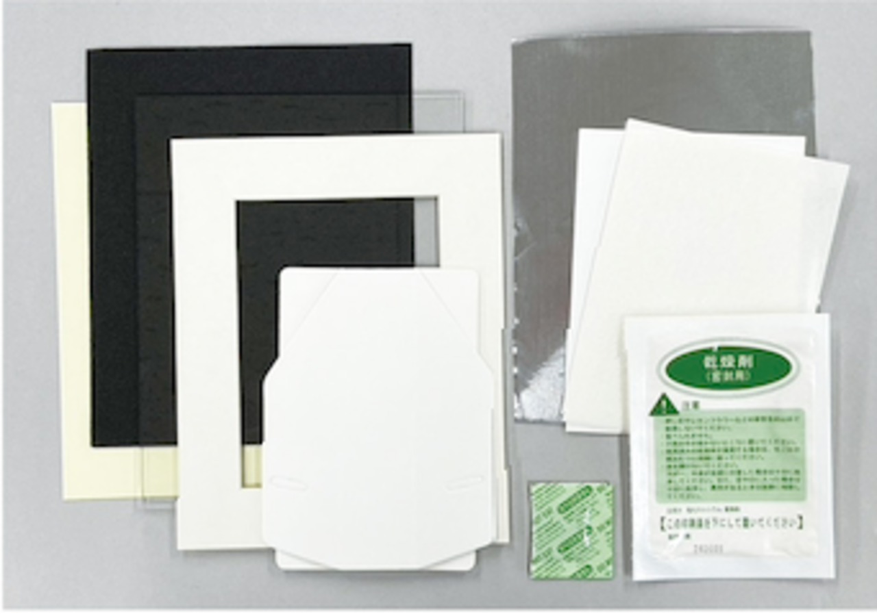 ガラス、両面粘着シート、粘着黒シート、アルミ粘着シート、白い厚紙、白クッション紙、中マット(白)、粘着枠、乾燥剤、脱酸素剤、専用スタンド×各1