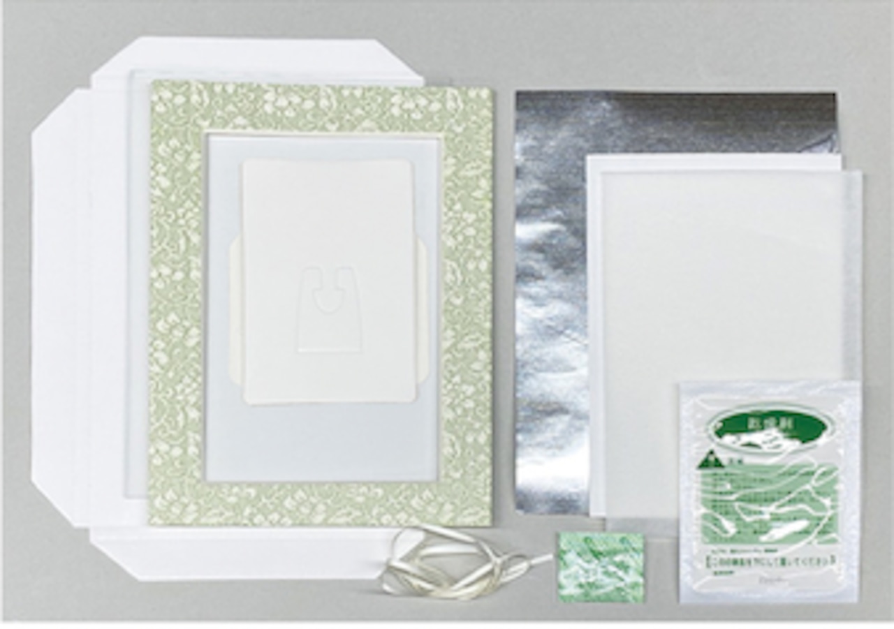 紙額、アルミ粘着シート、クッション紙、白紙、乾燥剤、脱酸素剤、紙製スタンド、リボン×各1